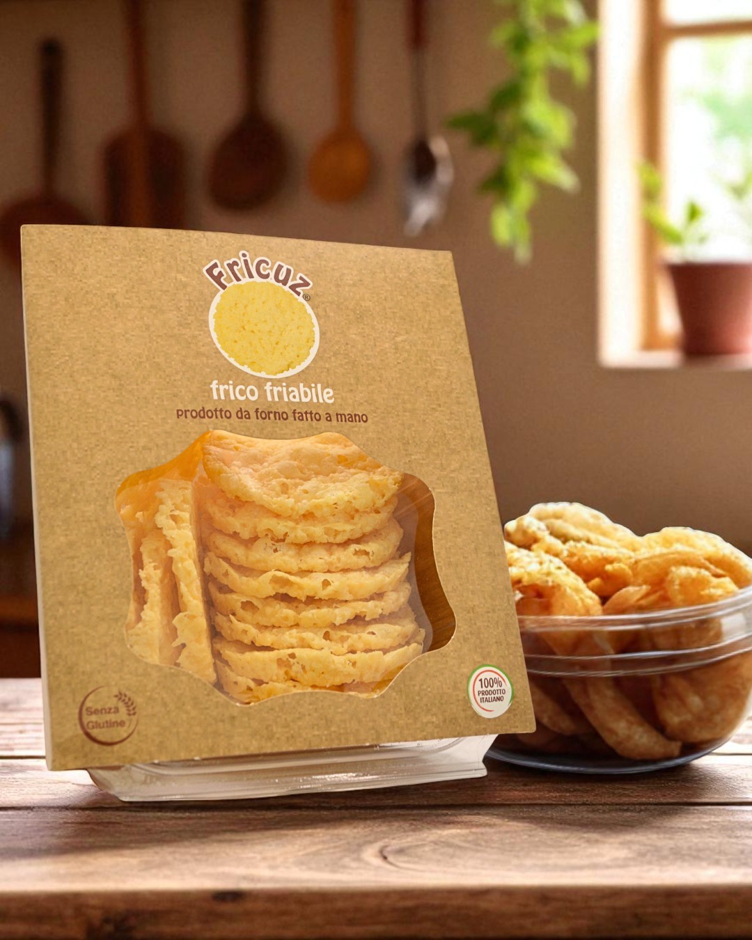 Founded in June 2022 in Resiutta (UD), Fricuz blends tradition and innovation with a recipe passed down from a maternal aunt. The company produces crispy frico (a traditional cheese crisp from Carnia) using only local Carnian cheese, entirely hand-processed and baked without added seasoning.